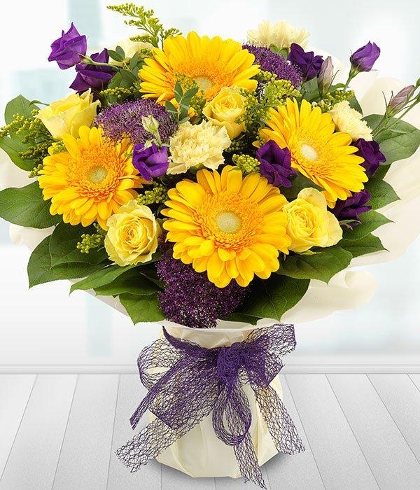 An aqua pack bouquet with a fabulous mix of bright yellow Roses, Gerberas and Carnations married with deep purple Lisianthus and Trachelium blooms.
