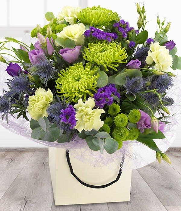 A cool, fresh, green and purple flower bouquet. Lilac Lisianthus and purple Statis have been cleverly combined with glorious green Chrysanthemums and Carnations to create this particularly unique arrangement.