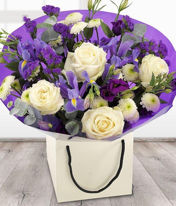 A pretty purple and white aqua pack bouquet featuring delicate white Roses and Spray Chrysanthemums with purple Lisianthus, Statis and Irises.