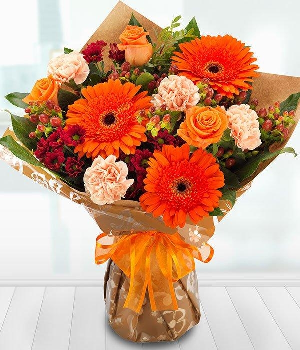 A superbly sumptuous and absolutely gorgeous aqua pack bouquet. Orange Roses and Gerberas sit amongst burgundy Spray Chrysanthemums and peach Carnations.