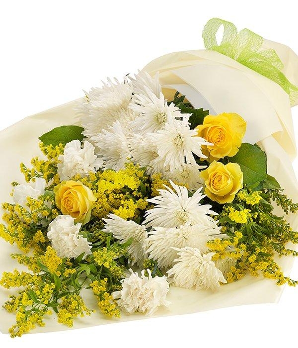 A glorious bright yellow Rose and white Chrysanthemum and Carnation bouquet, with a touch of yellow Solidago.