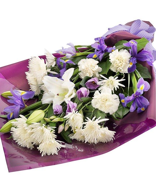 An incredibly beautiful bouquet of white Lilies, Spray Chrysanthemums and Carnations mixed with blue Irises and lilac Lisianthuses.