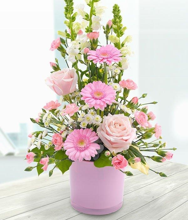 Pink Roses, Germinis and Carnations with delicate white Antirrhinums and Spray Chrysanthemums in a pretty pink glass vase.