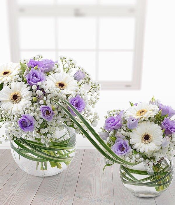 A gorgeous double vase arrangement for mother and baby. Lilac Lisianthus, white Germini and Gypsophila beautifully displayed in a spherical glass vase, delicately connected to a smaller vase with a flourish of Variegated China Grass.