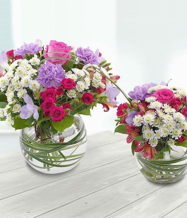 A beautiful gift for two. Pink Roses, lilac Freesias and Carnations married with white Spray Chrysanthemums in a spherical glass vase, connected to a smaller glass vase by Variegated China Grass.
