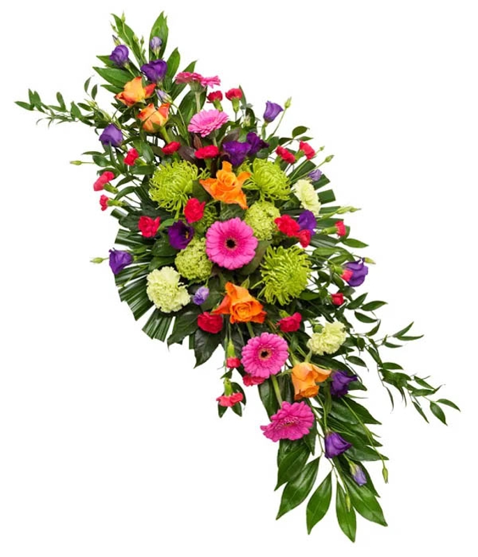 A vibrant double ended spray featuring orange Roses, pink Germini, purple Lisianthus with green Chrysanthemums and Carnations.