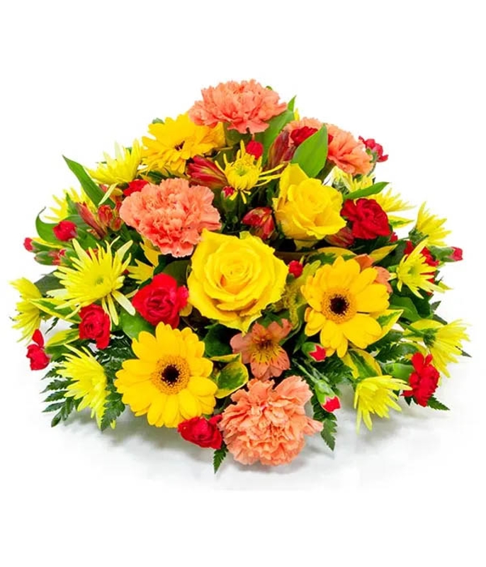 A bright coloured posy arrangement with yellow roses, yellow chrysanthemum, orange carnations and alstroemeria and red spray carnations.