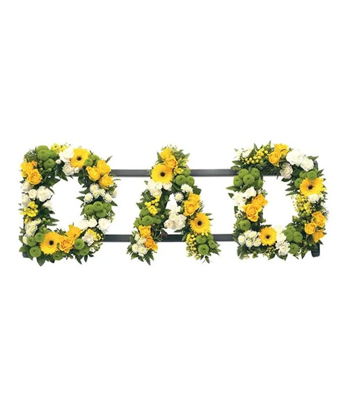 Pretty yellow Roses, Germini and Mimosa with white Chrysanthemums and Carnations form the name DAD. Stand included.