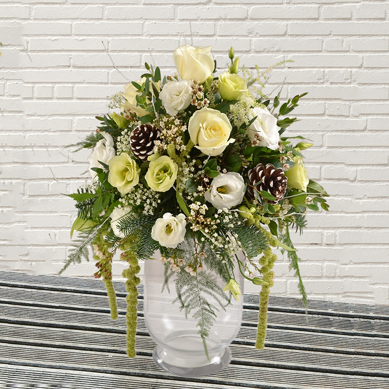 A fabulous white and green arrangement set in a hurricane lamp vase, a real Christmas treat.