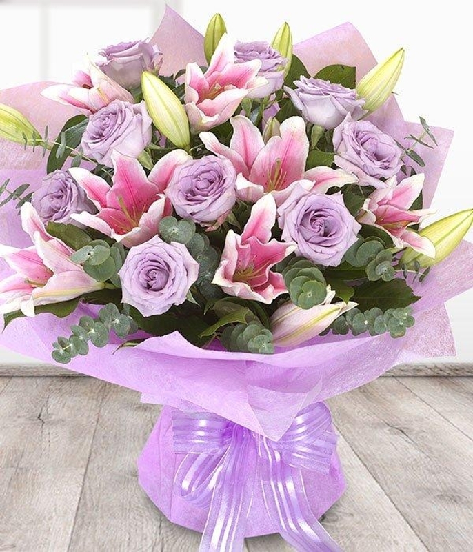 A very attractive combination of gorgeous lavender Roses and pretty pink Lilies. Aqua packed for freshness, it's ready to display.
