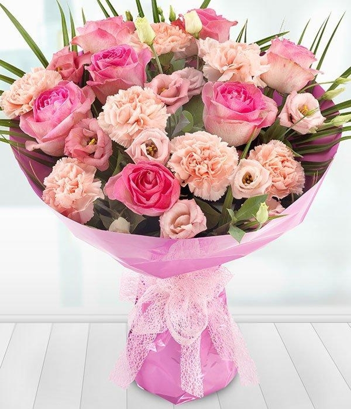 A divine collection of pink Roses, Lisianthus and Carnation blooms.